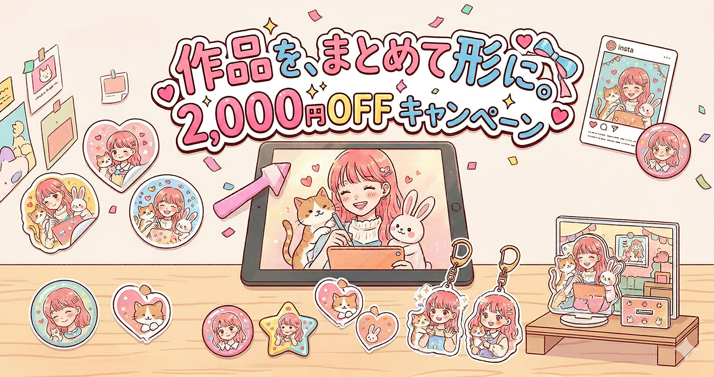バッジ 缶バッジ(フックピン) 1枚あたり ¥38 〜 バッジ 缶バッジ(安全ピン) 1枚あたり ¥81 〜 バッジ 缶バッジ(クリップ) 1枚あたり ¥103 〜 バッジ アクリルピンバッジ 1枚あたり ¥170 〜 バッジ アクリルバッジ 1枚あたり ¥190 〜 その他 缶マグネット 1枚あたり ¥93 〜 その他 缶キーホルダー 1枚あたり ¥93 〜 トレカ レギュラーサイズ 1枚あたり ¥33 〜 トレカ スモールサイズ 1枚あたり ¥33 〜 トレカ 名刺サイズ 1枚あたり ¥33 〜 アクリルスタンド Sサイズ 1枚あたり ¥180 〜 アクリルスタンド Mサイズ 1枚あたり ¥190 〜 アクリルスタンド Lサイズ 1枚あたり ¥400 〜 その他 推し活用絵馬 1枚あたり ¥280 〜 その他 アクリルフォトパネル 1枚あたり ¥3,850 〜 その他 変形ダイカットポストカード 1枚あたり ¥75 〜 その他 定型ポストカード 1枚あたり ¥50 〜 その他 メモリアル アクリルブロック 1枚あたり ¥1,540 〜 アクリルキーホルダー Sサイズ 1枚あたり ¥180 〜 アクリルキーホルダー Mサイズ 1枚あたり ¥190 〜 アクリルキーホルダー Lサイズ 1枚あたり ¥400 〜 その他 販売用アートキャンバス 1枚あたり ¥3,905 〜 その他 展示販売用アート印刷 1枚あたり ¥1,430 〜 ステッカー コート紙シール 1枚あたり ¥34 〜 ステッカー マット紙シール 1枚あたり ¥28 〜 ステッカー ホワイトステッカー 1枚あたり ¥44 〜 ステッカー サテンシール 1枚あたり ¥47 〜 ステッカー 弱粘着ステッカー 1枚あたり ¥44 〜 ステッカー シルバーステッカー 1枚あたり ¥47 〜 ステッカー クリアステッカー 1枚あたり ¥47 〜 ステッカー ハーフクリアステッカー 1枚あたり ¥44 〜