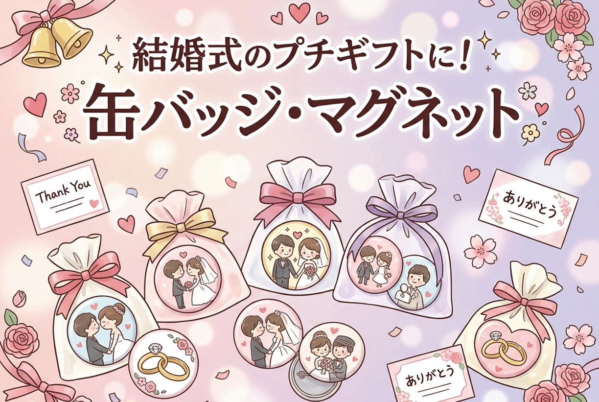 結婚式のプチギフトに!1個から作れるオリジナル缶バッジ・マグネット