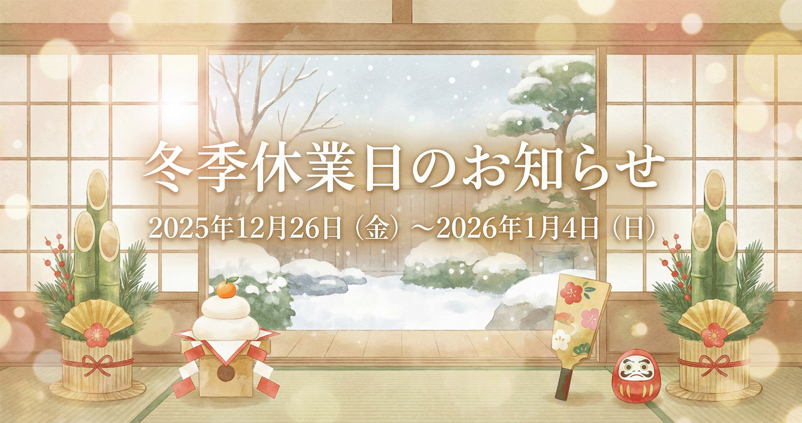 期間中もWebサイトからのご注文・お問い合わせは通常どおり受け付けておりますが、休業期間中にいただいたご注文やお問い合わせにつきましては、2026年1月5日(月)より順次対応・ご返信させていただきます。